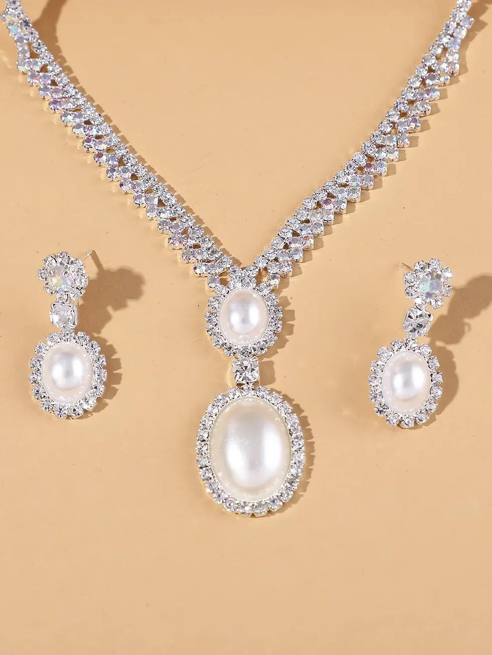 Jade Lion Ivory Oval Pearls AB Silver Rhinestone Necklace and Earrings Set